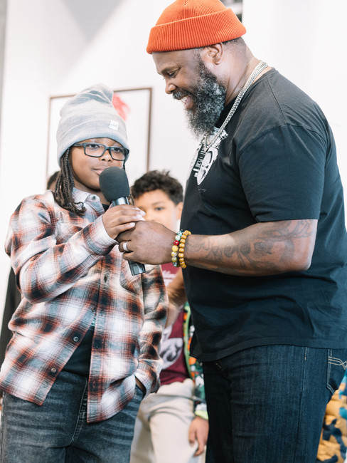 Kingston Kirkland with his father, Gallery Curatorial Manager, Hasaan Kirkland. 2. Jalen Wiles with his ceramic sculpture, Mask of Fear.